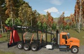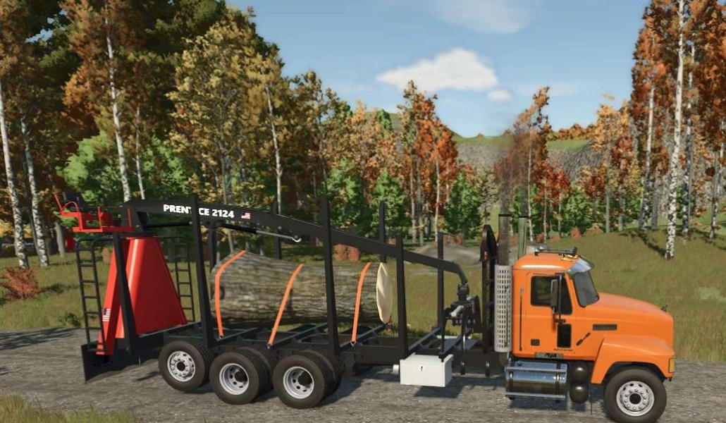 This heavy-duty logging truck features a robust orange Mack chassis paired with a specialized log trailer equipped with the Prentice 2124 loading crane. Designed for efficient forestry operations, the vehicle combines powerful hauling capabilities with an integrated hydraulic log loader for quick loading and unloading. The trailer’s sturdy frame with multiple axles ensures stable transport of heavy timber loads across challenging terrain. Perfect for players looking to expand their forestry operations in Farming Simulator 25, this authentic logging setup brings professional-grade equipment to your virtual forest harvesting tasks.